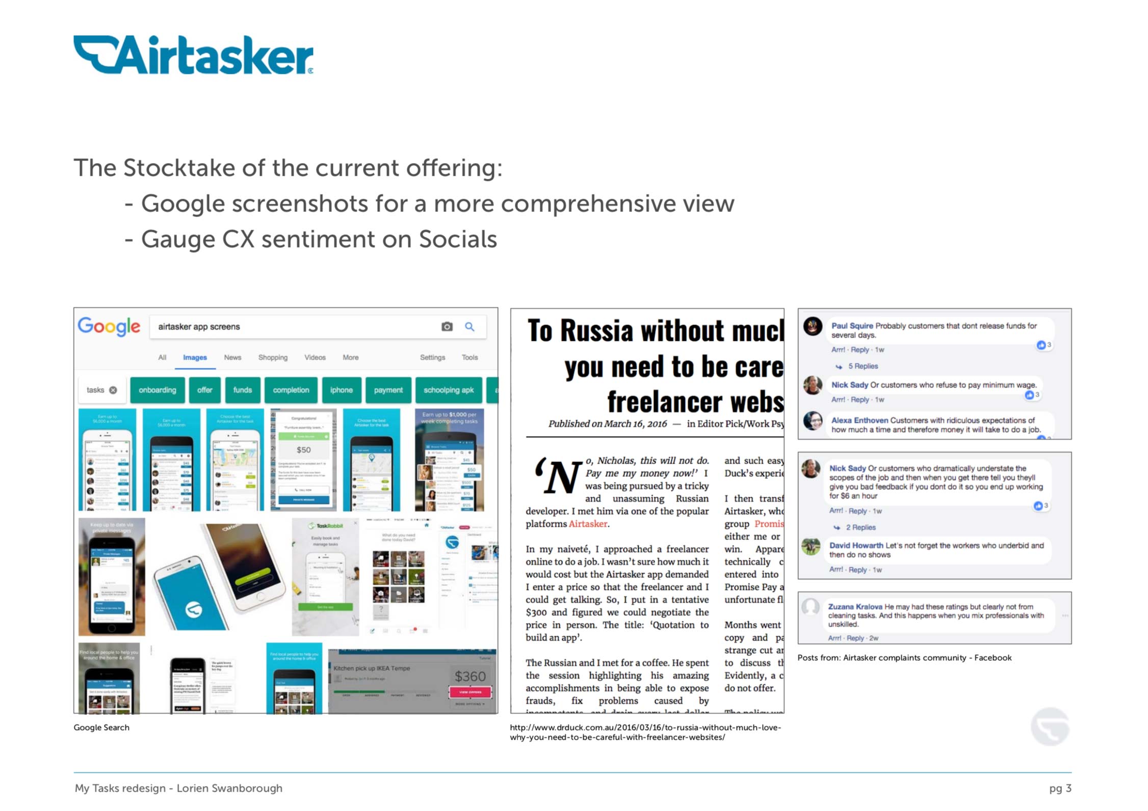 I didn't have the access or time to conduct interviews with Airtasker users, nor access to the app's stats/ analytics/ heat maps, to truly understand where problematic issues were. How to take a product forward if we can only assume where the problems lie? This was how I tackled this common spec work scenario, to build a comprehensive understanding of where Airtasker currently sits in the eyes of the consumer: from its current social media pages and web reviews.