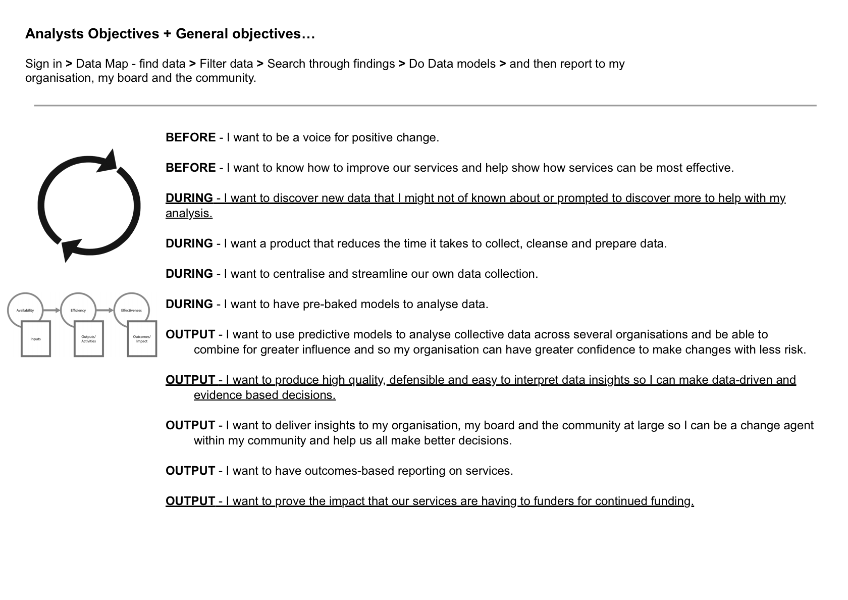 - Output: I want to produce high quality, defensible and easy to interpret data insights so I can make data-driven and evidence based decisions.